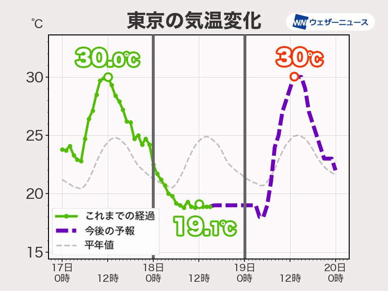 今夜から明日19日(水)の朝にかけても大きな気温の変化はない見込みです。太陽が昇ってからは一気に気温が上昇して、昼過ぎには30℃に到達する予想となっています。