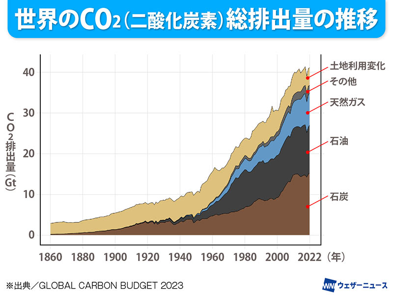 ところが、産業革命によって石油・石炭・天然ガスなどの化石燃料が大量に消費されるようになり、CO2の排出量が急上昇したのです。