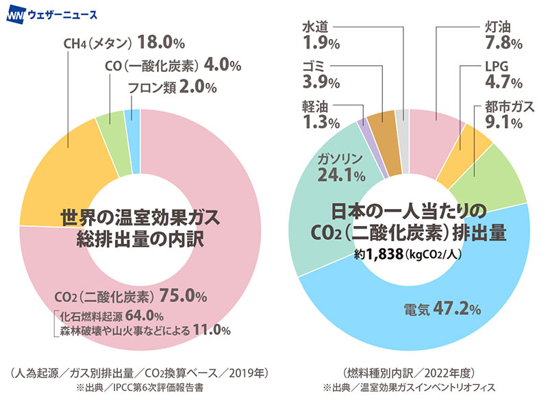 「日本の場合を見ると、電気を使うことによる排出が圧倒的に多く、47.2%も占めています。次いでガソリン、都市ガス、灯油……と続きます(上記右の円グラフ)。