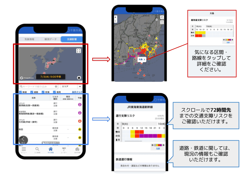 3時間ごと72時間先までの予測が、5段階の「交通支障リスク」としてご覧いただけます。