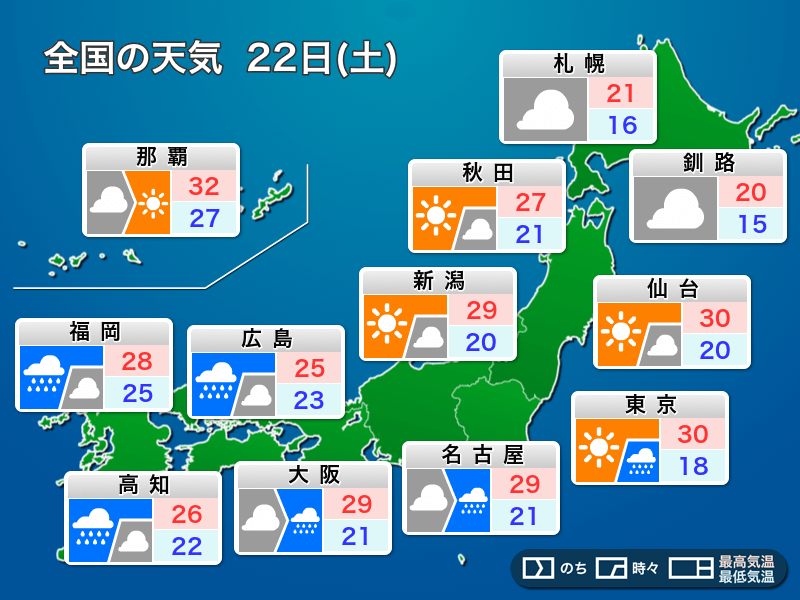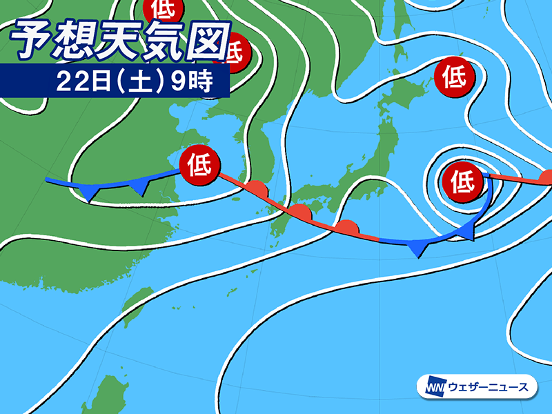 明日22日(土)は梅雨前線が日本海西部まで北上します。西日本は雨が降り、激しい雷雨となるおそれがあります。関東は天気が回復して暑くなりそうです。