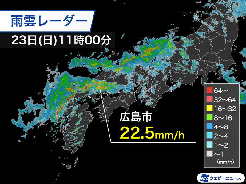 昼近くなって九州北部から中国地方が活発な雲に覆われていて、11時00分までの1時間には広島市で22.5mm、山口県萩市で26.5mmの強い雨を観測。24時間雨量は島根県の一部で100mmを超えています。