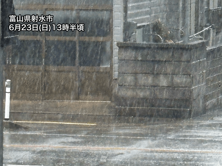 梅雨前線が日本海まで北上していて、能登半島の沖合を低気圧が進んでいます。低気圧や前線に向かって暖かく湿った空気が強く流れ込んでいるため雨雲が発達し、その雲が午後になって北陸にかかってきました。