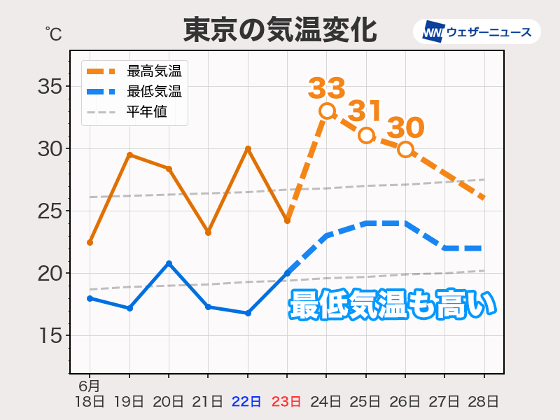 また、これまでと大きく違うのが最低気温。朝もあまり気温が下がらず、東京都心では23〜24℃くらいの日が多くなるとみられます。最低気温が高いと、一日の中で暑さを感じる時間が長くなり、それだけ体への影響が出てきます。