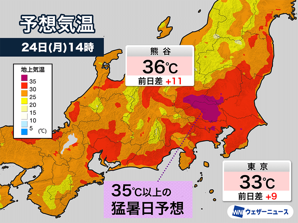 特に内陸部は気温の上がり方が顕著です。埼玉県から群馬県南部、栃木県南部に35℃以上のエリアが大きく広がり、埼玉県熊谷市や前橋市の最高気温は36℃まで上がる予想となっています。東京都心も今年最高の33℃まで上がる上、湿度が高いためかなりの蒸し暑さになります。