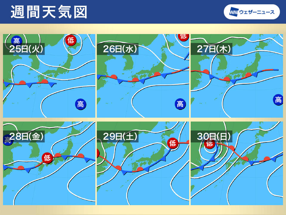 前線の位置や湿った空気の流れ込み方次第では大雨となる所が出てくるかもしれません。最新の予報を随時確認し、大雨への備えを行うようにしてください。