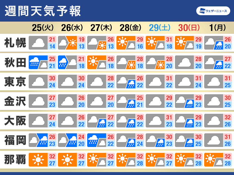 前線の影響を受けづらい関東では、26日(水)頃にかけて30℃以上の真夏日となります。その後は全国的に平年並みの気温となるものの、週末には北日本を含む広い範囲で30℃以上の真夏日となるところが多くなる見込みです。