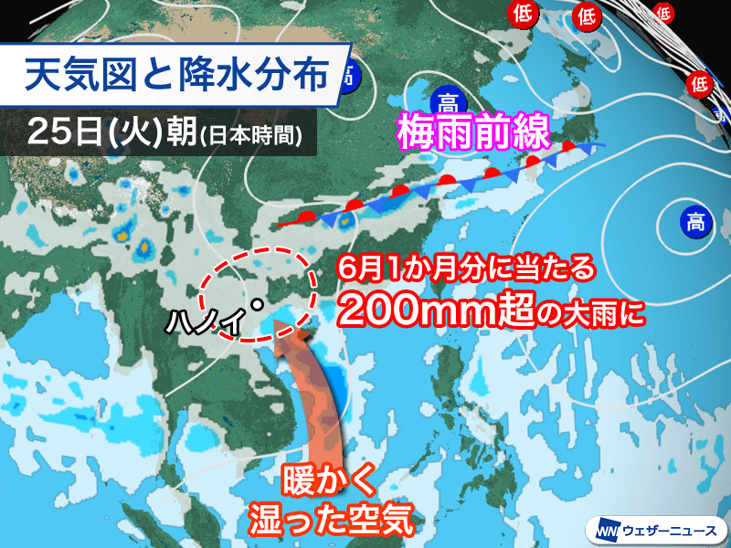 日本列島に梅雨空をもたらしている梅雨前線は東シナ海から中国大陸へと長く伸びています。梅雨前線に向かって南シナ海から暖かく湿った空気が流れ込むことで、ベトナムは北部を中心に雨雲が発達しやすい状況です。