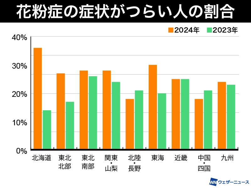 西日本は花粉の飛散量が昨年・平年ともに大きく下回ったものの、つらい割合に大きな減少は見られませんでした。飛散開始からすぐに飛散が本格化したことが影響した可能性が考えられます。