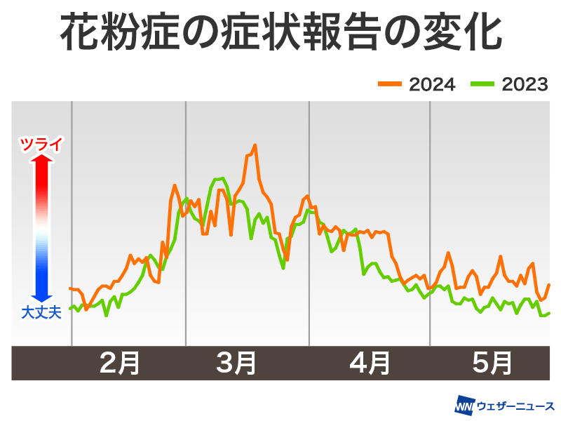 花粉症の症状のつらさはどうだったのか、スマホアプリ「ウェザーニュース」のユーザーから寄せられた症状報告(のべ127,299通)を分析しました。