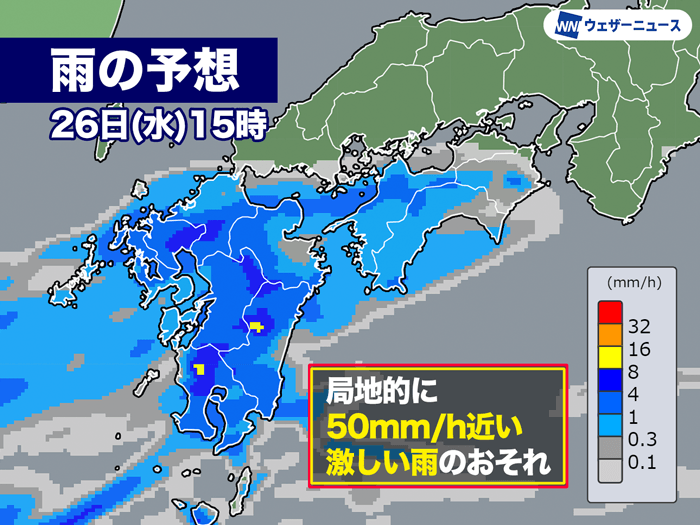 このあとは前線に向かって湿った空気が流れ込む影響で、広範囲で雨の強まる見込みです。すでに鹿児島県の西の海上には発達した積乱雲が見られ、午後にかけて九州南部などに進んでくるとみられます。今夜にかけては断続的に雨の強まることが予想され、局地的には1時間に50mm近い激しい雨が降ることも考えられます。九州北部や四国、中国地方の瀬戸内海側でも本降りの雨となるところがある見込みです。