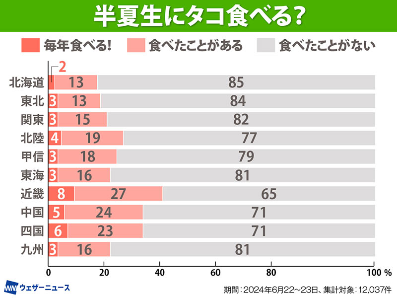 ウェザーニュースでは、「半夏生にタコ食べる?」というアンケートを実施しました。「毎年食べる!」「食べたことがある」「食べたことがない」の3項目を挙げてウェザーニュースアプリの利用者に尋ねたところ、全体で見ると「食べたことがない」が79%と、多数を占めました。