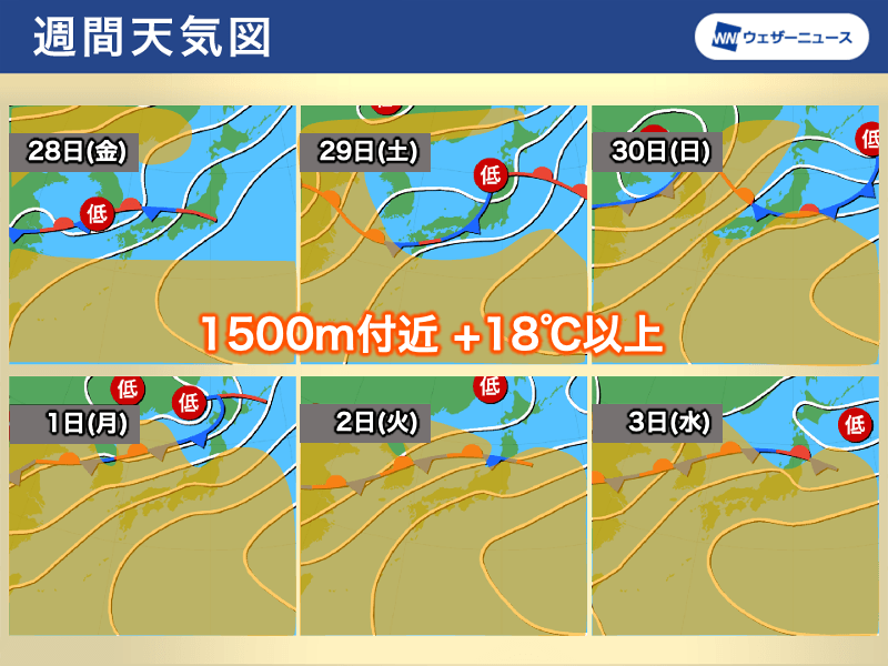 29日(土)は本州の太平洋側に梅雨前線がのび、上空1500m付近で+18℃以上の夏の空気が西日本を中心に流れ込む見込みです。30日(日)になると前線が西から北上し、それとともに暖気も北に拡大するとみられます。