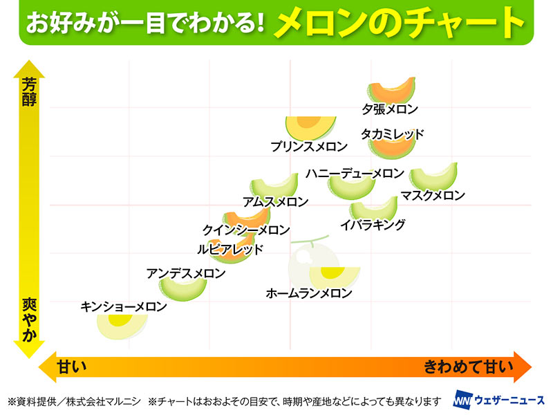 このメロンチャートを活用して、お好みのメロンを選び、美味しくいただいてこれから本格化する夏に備えましょう。