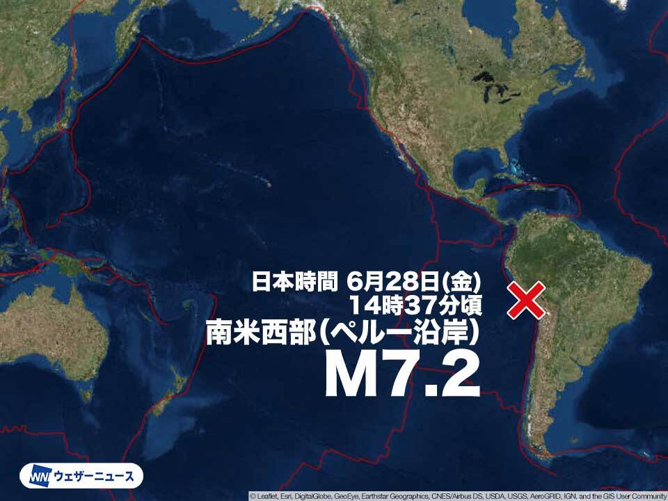 日本時間の6月28日(金)14時37分頃、海外で規模の大きな地震がありました。震源地は南米西部(ペルー沿岸)で、地震の規模(マグニチュード)は7.2と推定されます。