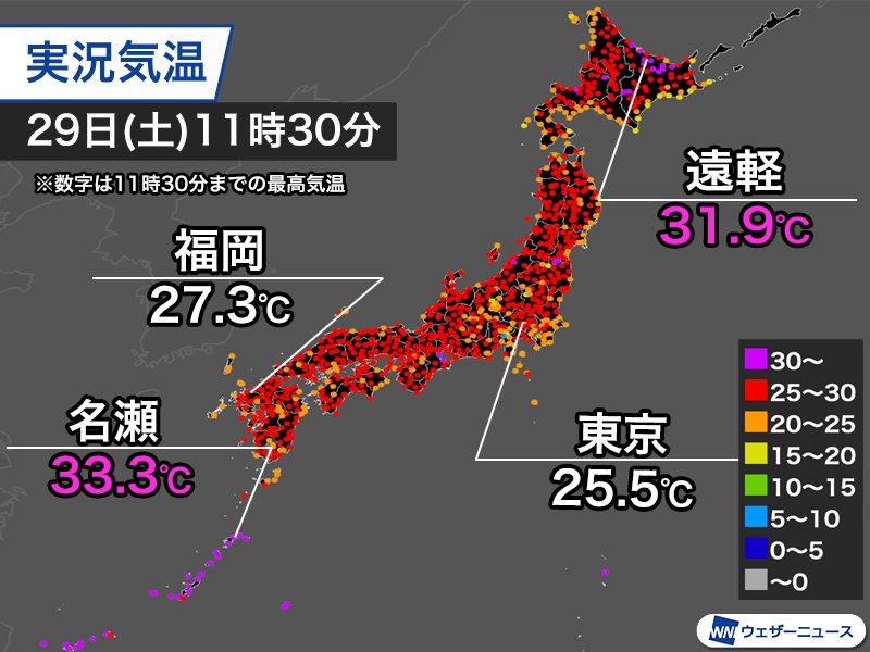 11時時点で30℃以上の真夏日地点は46地点となっており、北海道や沖縄、鹿児島県奄美地方で真夏日地点が多くなっています。