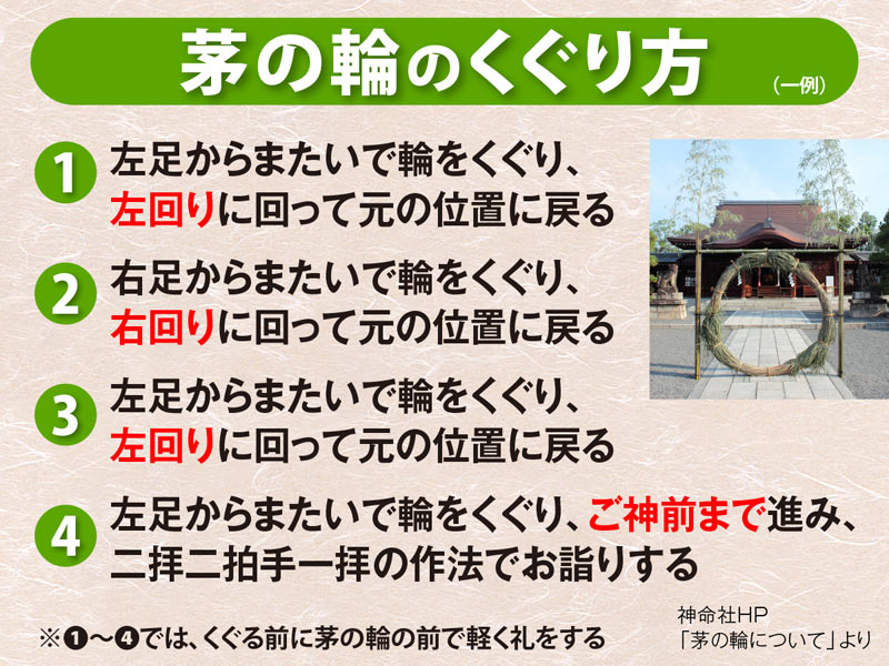 この故事から、厄除けのために茅の輪を腰に身につけるという信仰が広まり、時代とともに茅の輪が大きくなり、現在のようにその輪の中をくぐるという形になったようです。