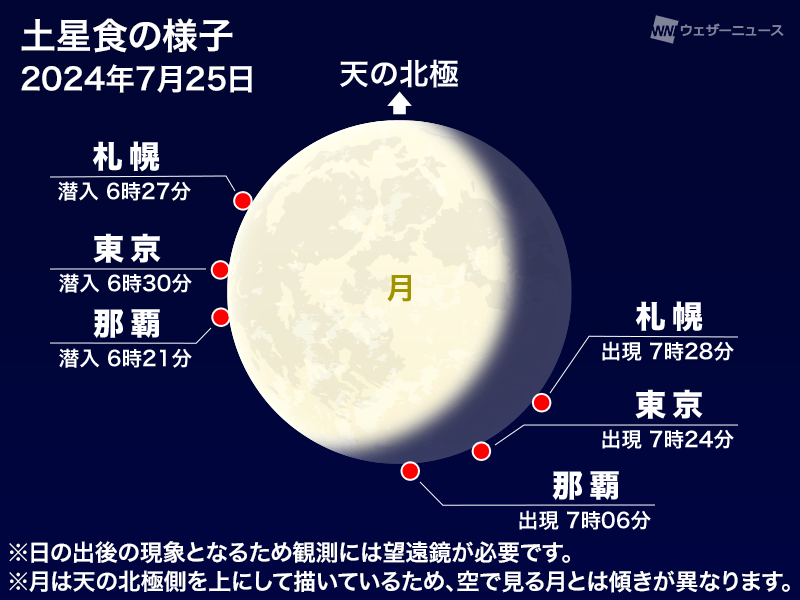 土星食は、土星が月に潜入・出現する時刻、月の高度、月の縁に対してどこに見えるかは、観察場所によって異なります。
