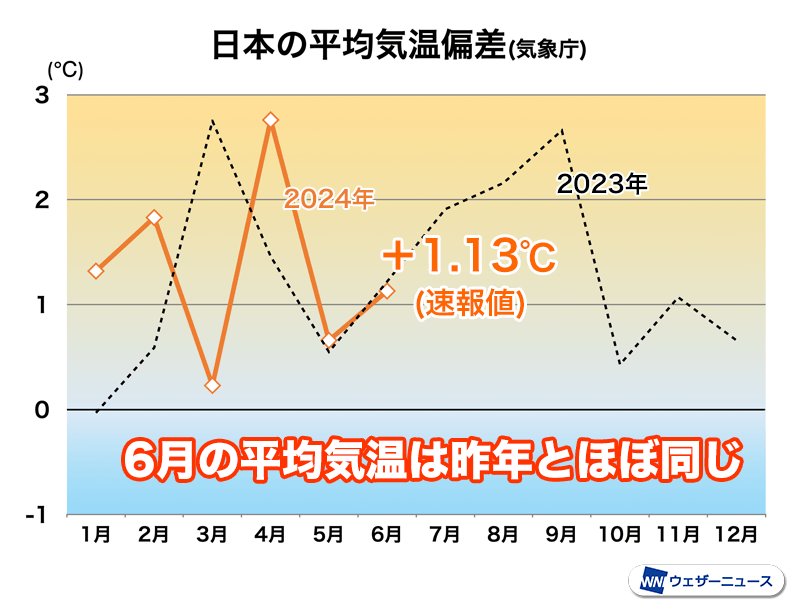 5月に比べると若干平年との乖離が大きくなり、平年よりも高い状況は17か月連続に伸びました。観測史上2番目に高かった昨年とほぼ同じ水準になる見通しです。