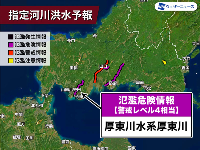 梅雨前線の活動が活発している影響で、山口県では非常に激しい雨となっています。3時間で100mmを超える雨が降っており、大量の雨水が河川に流れ込んで、水位が上昇しました。