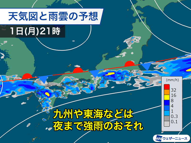 梅雨前線は今夜にかけてもほとんど位置を変えず、その南側で雨雲の発達しやすい状況は続きます。上空の気圧の谷が抜けていくため、強い雨の範囲は縮小するものの、九州や東海など局地的に雨が強まる見込みです。