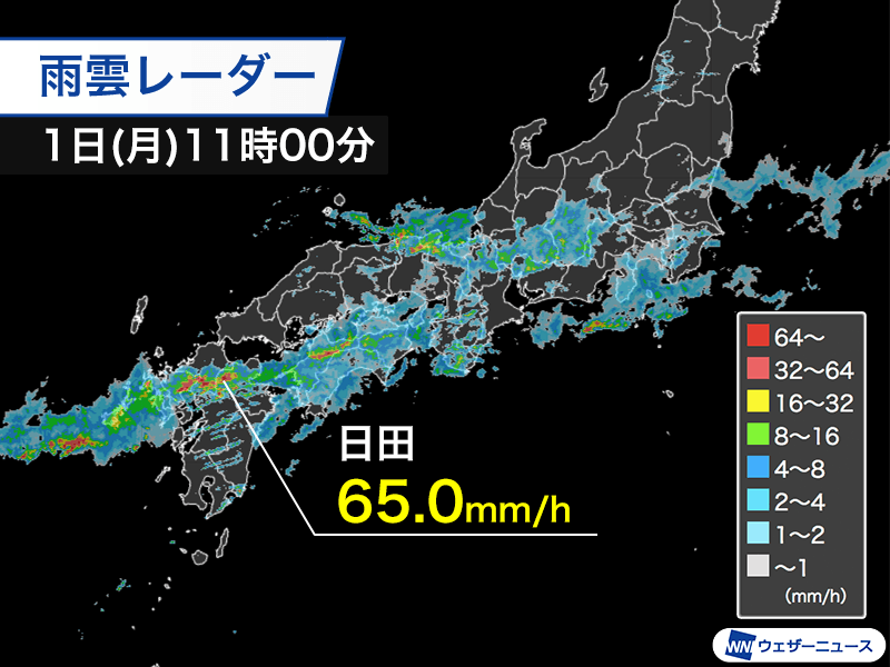 11時00分までの1時間には大分県日田市で65.0mm、福岡県八女市・黒木で59.5mm、佐賀県嬉野市で52.0mmの非常に激しい雨を観測しました。