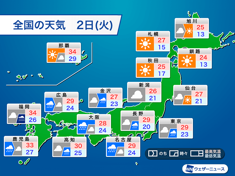 明日2日(火)は梅雨前線が西から北上し、九州などには今日以上に暖かな空気が流れ込んできます。福岡市の最高気温は34℃の予想です。
