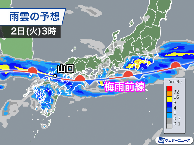 夏の太平洋高気圧が勢力を強め、梅雨前線は西から北上します。九州では今夜まで断続的に雨が降り、その後は強雨の中心が中国地方に移っていく見込みです。