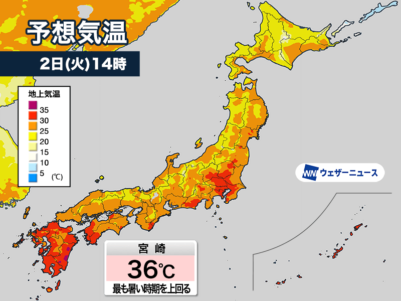 九州南部や沖縄は最高気温35℃前後に