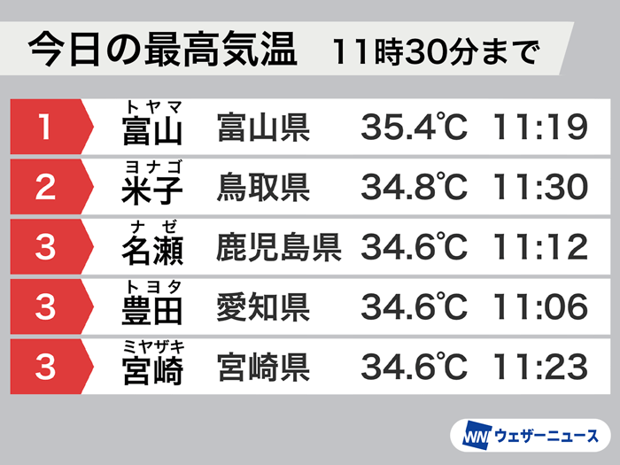 11時30分までの最高気温は、富山市で35.4℃と午前中から猛暑日となりました。鳥取県米子市で34.8℃、金沢市で34.5℃と日本海側を中心に35℃近くまで上がっているところもあります。