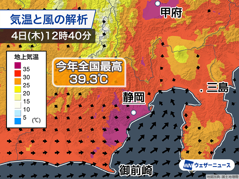 その中でも気温の上昇が顕著なのが静岡市です。朝の9時過ぎには早くも35℃に到達し、13時21分には39.3℃まで上昇しています。これは1995年に記録した38.7℃を更新する観測史上1位の高温です。