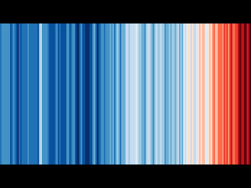 Climate Stripesは「気候ストライプ」と訳すことができ、気温を表した縞模様のことです。世界各国各地の過去、百数十年間の気温の変化を色で表していて、地球温暖化を視覚的に訴えています。
