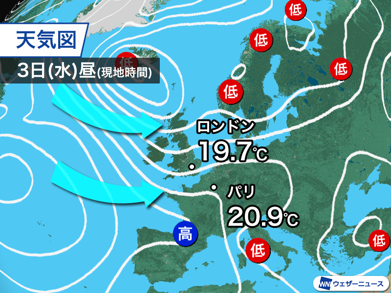 ロンドンの中心部では2日(火)、3日(水)と最高気温が10℃台に留まりました。この時期の平年に比べても2〜3℃ほど低い気温です。パリでも7月に入ってからは20〜22℃くらいと、平年より低めになっています。