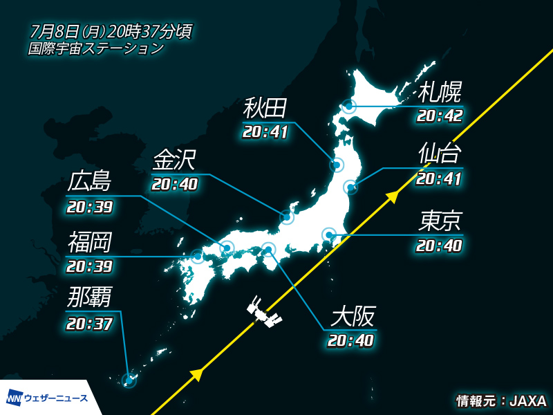 今夜は、関東以西の太平洋側で晴れるところが多い予想です。国際宇宙ステーションの観測チャンスといえそうです。