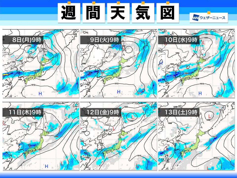 週の前半は日本海側に前線が停滞し、北陸など日本海側で雨の降る所が多くなります。湿った空気が流れ込んで雨雲が発達し、雨の強まる所がある見通しです。週の後半になると梅雨前線が少し南下するため、太平洋側でも雨が降りやすくなります。