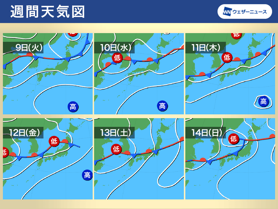 明後日9日(火)以降は梅雨前線がさらに南下し、本州付近に停滞する日が多くなります。西・東日本では曇りや雨となって気温は30℃前後の日が多くなる予想です。