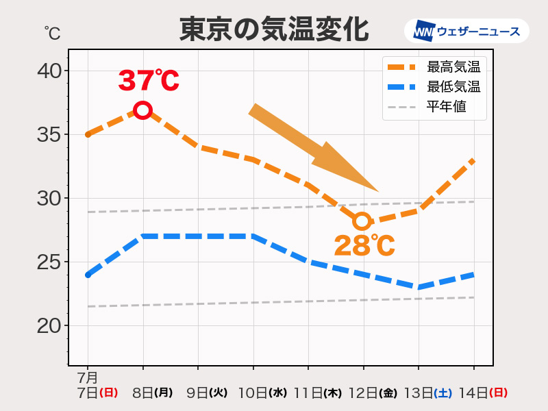 体感としては暑い日が続きますが、ここ数日のような深刻な暑さは幾分和らぐ予想です。ただ、湿度が高くなる日が多くなるので、油断することなく熱中症対策を万全にするようにしてください。