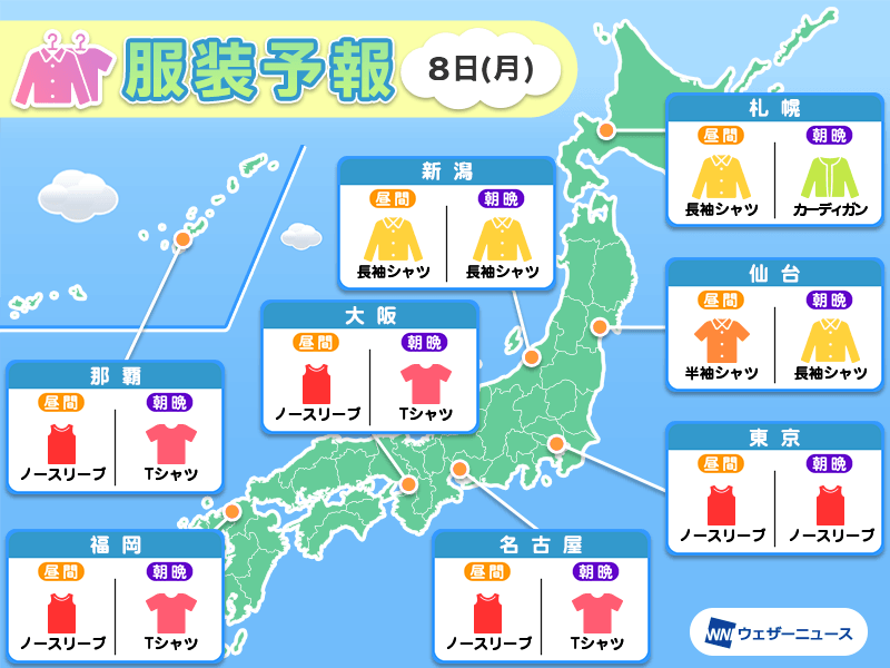 7月8日(月) 各地の気温変化と最適な服装