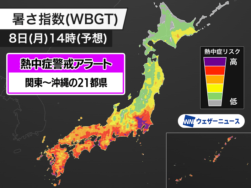 関東以西の21都県に熱中症警戒アラート 明日8日(月)対象
