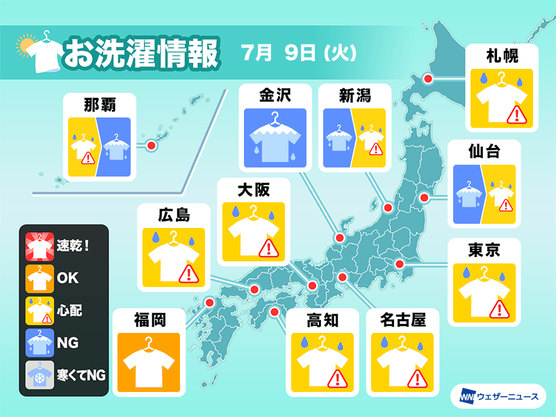 東京など関東、愛知や大阪、福岡などは日差しが届いてもにわか雨の可能性があります。外干しする場合は、空の変化にご注意ください。