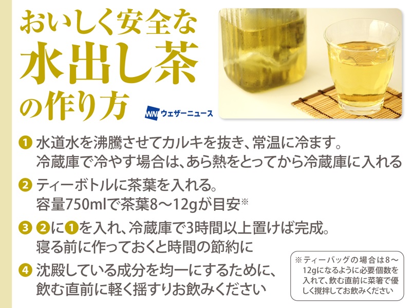 お茶を作るときに必要なのは水と茶葉ですが、安全な水出し茶を作るには、どこに気をつければいいのでしょうか。