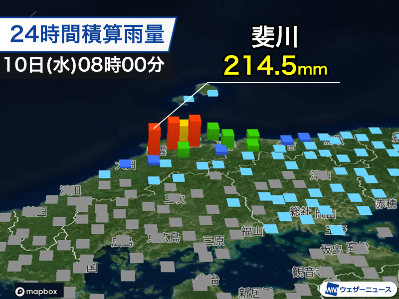 今日10日(水)8時00分までの24時間降水量は、島根県の斐川で214.5mm、鳥取県の米子で148.0mm、秋田県の大曲で146.5mmを観測しています。