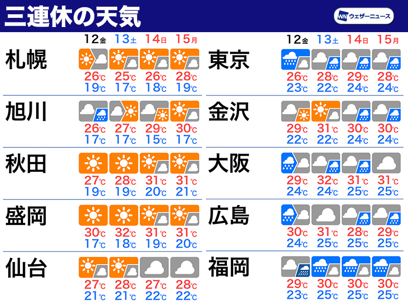 これから三連休にかけては、西日本や東日本は梅雨空が続きます。一方、ほたるが見頃の北日本は雲が多いものの、雨の降る日は少ない見込みです。気温は高くジメジメとしたこの時期らしい体感で、観賞に適した条件です。