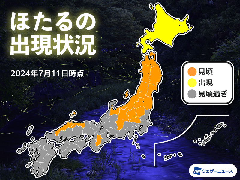 また、北海道でもほたるが現れはじめました。道央の沼田町ほたるの里や札幌市西岡公園などでも蛍の数が増えているようです。道東や道北でも、7月中に見頃となる見込みで、北日本でもいよいよほたるのシーズンとなっています。
