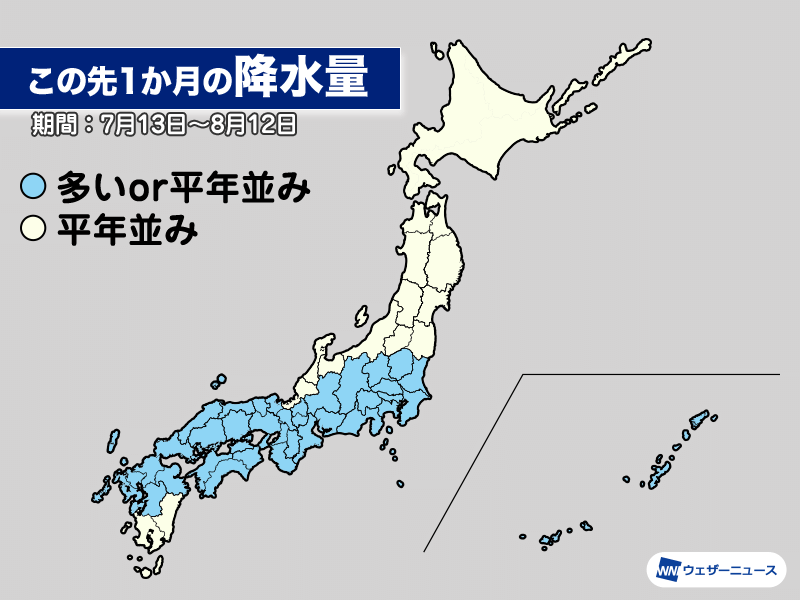 目先の雨量が多くなる可能性があるため、1か月の降水量は関東から九州にかけて平年並みか多い予想になっています。梅雨明け後は、各地とも真夏らしい天気になりそうです。