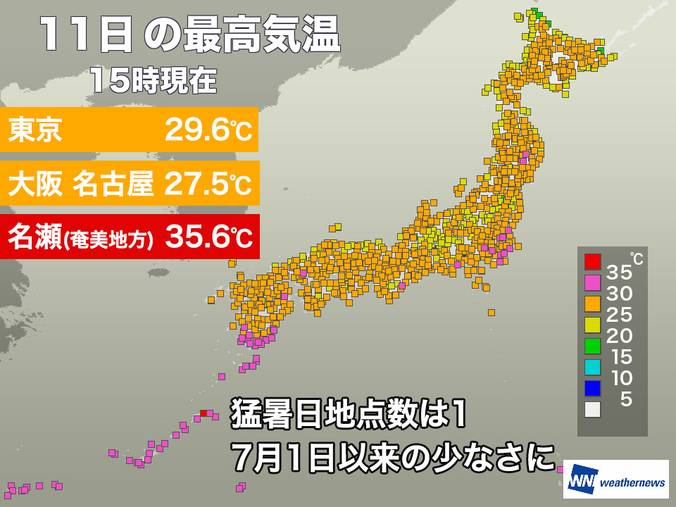 35℃以上の猛暑日となった地点は35.6℃を観測した鹿児島県奄美地方の名瀬のみで、7月1日以来の少なさです。