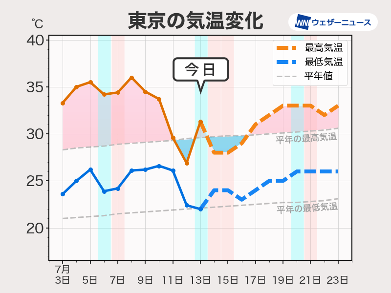 東京都心の最高気温は雲が多い三連休明けの16日(火)まで30℃に届かない予想となっています。17日(水)以降は徐々に暑さが増し、19日(金)〜20日(土)は33℃まで上がる見込みです。