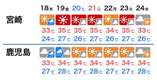九州南部ではこの先も太平洋高気圧に覆われて晴れる日が多くなります。明日や明後日は湿った空気の影響で雨の降る可能性がありますが、梅雨前線の影響を受ける日は予想されていません。