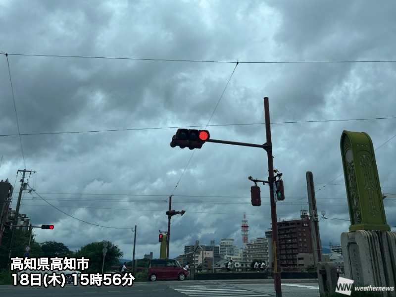 西日本には太平洋高気圧の縁をまわる湿った空気が流れ込んでいます。16時30分現在は中国・四国のところどころで雨が降っていて、一部には活発な雨雲もある状況です。高知県いの町本川では、1時間に2.5mmの雨を観測しました。