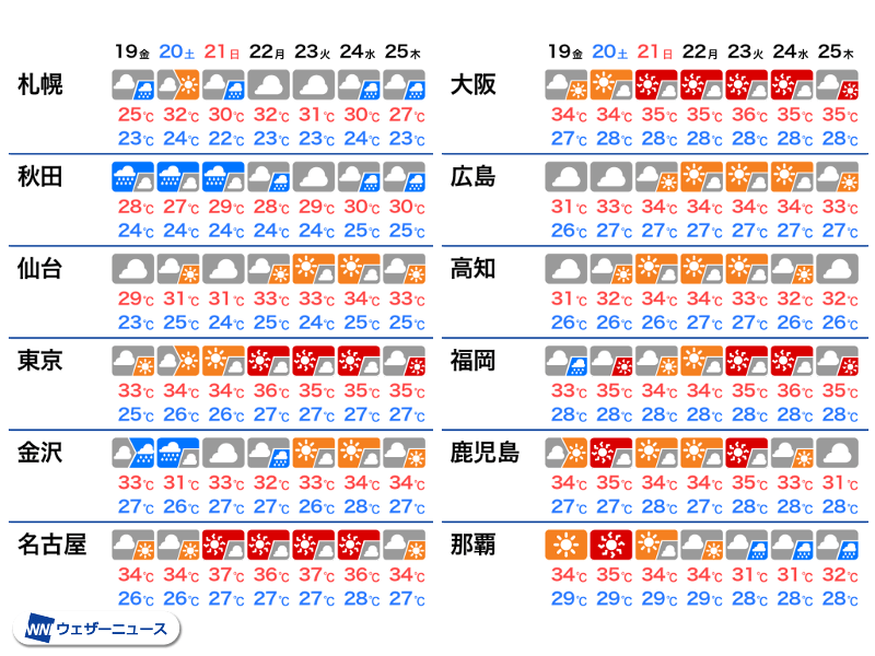 20日(土)になると前線は再び北上傾向で、来週にかけて南の太平洋高気圧が張り出しを強める予想です。四国は20日(土)に、近畿や中国・九州北部は21日(日)に梅雨明けとなる可能性があります。